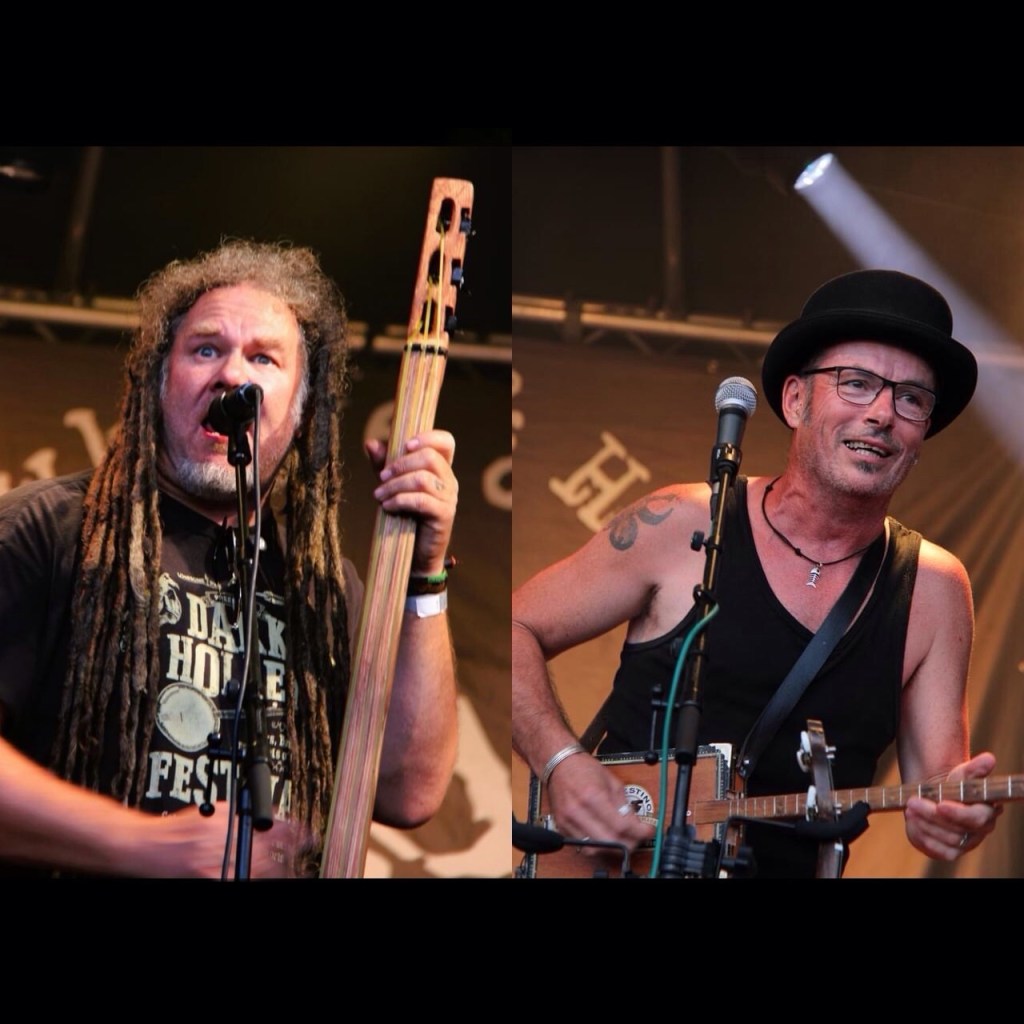 Traditional and yet very different, Hawkeye and Hoe are an English duo playing country, folk, blues, irish and what they like to call beer drinking music.The live tour has so far lasted 35 years, and used at least 18 cars, 5 double basses, 9 guitars, 6 banjos, 6 cigar boxes, 5 rubber chickens a couple of fiddles, a rubber duck, and a fish on a stick! Hawkeye and Hoe’s entertaining show is full of easy to sing choruses, a good dose of humour, and a mass of energy.